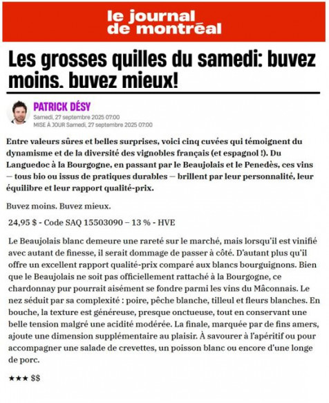2 octobre 2025 Eloge de notre Beaujolais Blanc 2024 dans le journal de Montréal par Patrick Désy Partager sur