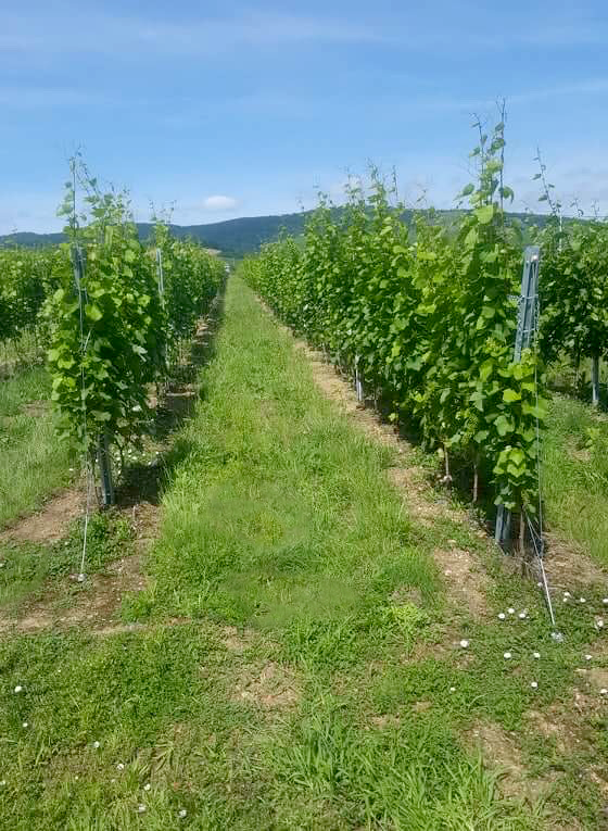We mechanically till the soil to remove grass under the vine rows in most of our plots, avoiding the use of chemical herbicides.