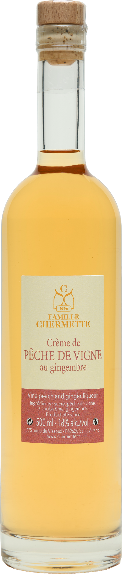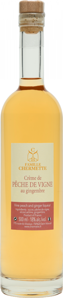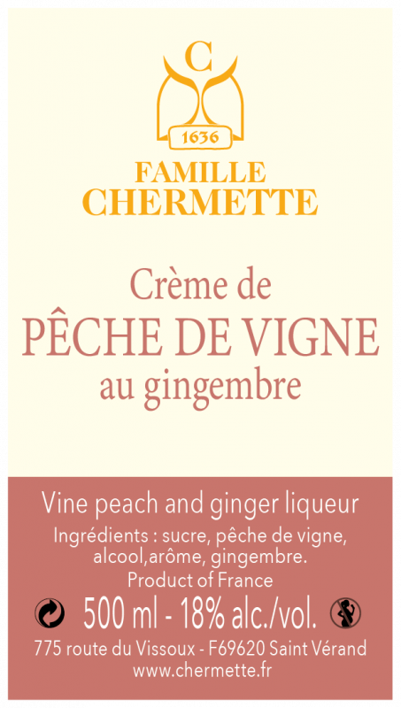 This makes an exotic, delicious and spicy apéritif! Our new crème is made using (small, flavourful, purple) vine peaches and fresh ginger.